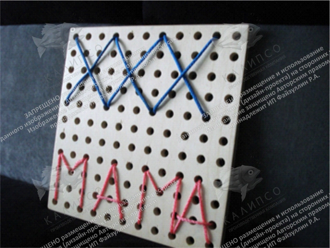 Задача игры -продевая шнурок через отверстия, «вышить» какой –либо узор или геометрическую форму, орнамент, букву или цифру.