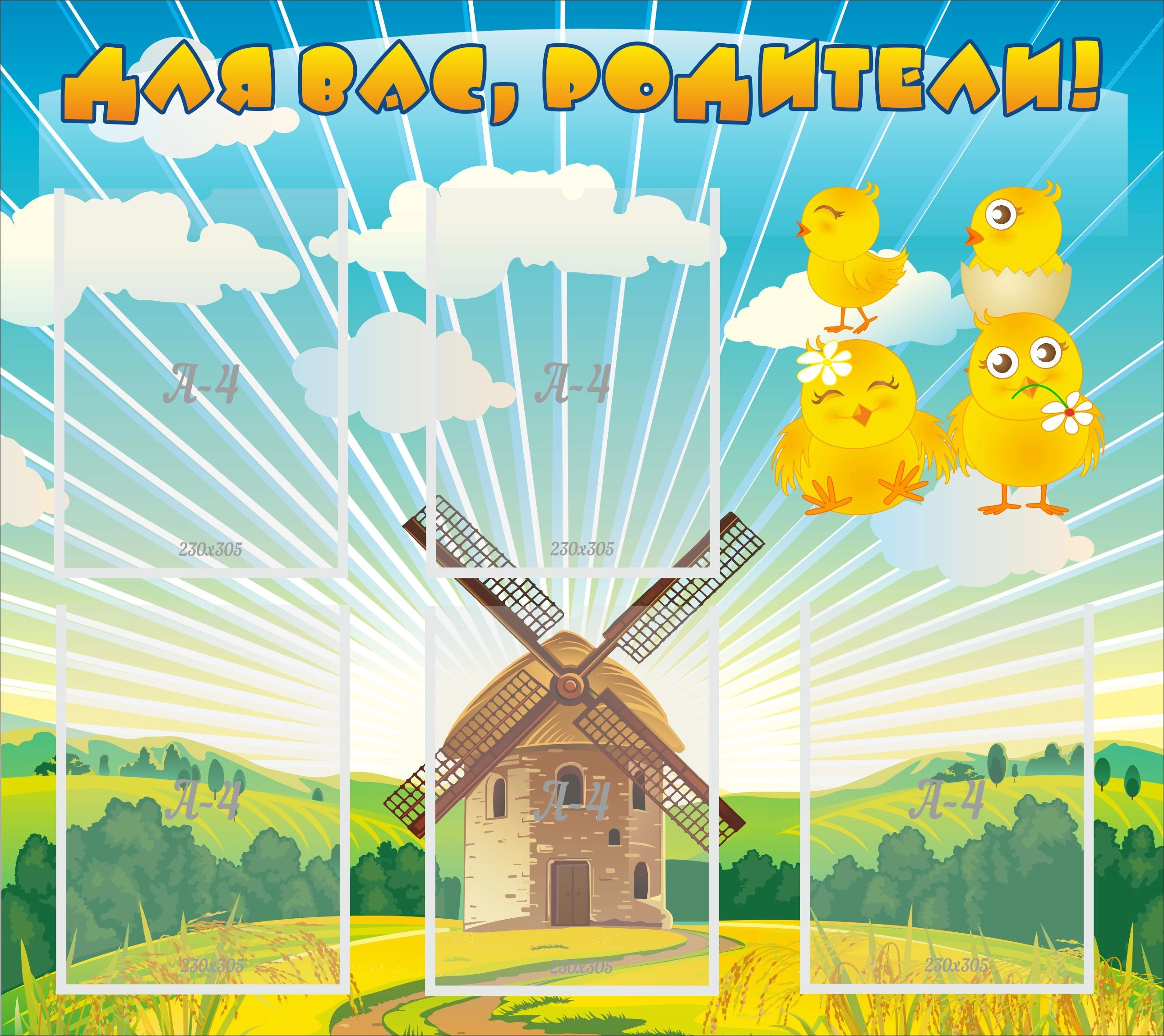 Информационный стенд для родителей с изображением милых цыплят, имеет пять специальных карманов размером в стандартный лист А4, это прекрасная возможность донести необходимую информацию для родителей. Стенд удобный и практичный, его легко установить в любом помещении и на любой поверхности. Стоит отметить, что он сделан из высококачественного материала, со специальным защитным покрытием, что позволяет сохранить яркость цвета и рисунки максимально долго. Стенд станет гармоничным дополнением в общую атмосферу детского сада, а яркие картинки привлекают внимание детей и очень им нравятся. Стенд может быть изготовлен в размере 0,75х0,8 м