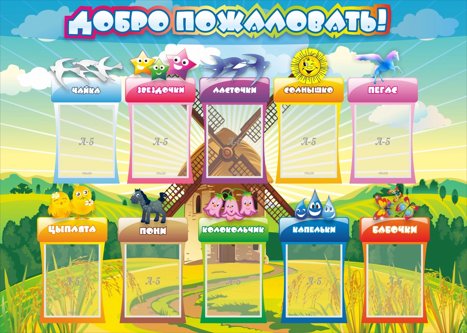 Стенд «Добро пожаловать» украсит холл при входе в детский садик и познакомит с группами, которые в нем занимаются. В качестве фона дизайнерами выбрана тематическая картинка мельницы и бескрайних полей.