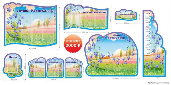 Данные тематические стенды созданы нашими дизайнерами для группы «Колокольчик». Главным элементом дизайна является лиловый колокольчик, который расцвел на зеленой поляне. Недалеко течет быстрая речка, а вдали виднеются домики. В карманах можно поместить важный материал для родителей, а также групповые фотографии. По желанию заказчика, наши специалисты могут внести любые изменения в дизайн стенда. При изготовлении используется современный качественный материал.