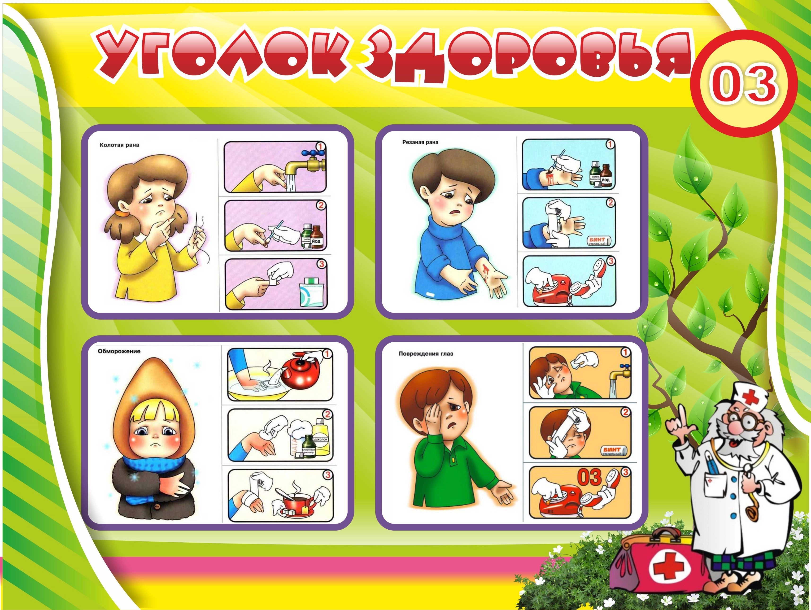 Как рассказать ребенку о первой помощи в разных ситуациях? В этом помогут наглядные картинки из нашего стенда. Стенд имеет четыре тематические картинки, которые рассказывают малышам о правилах первой помощи при колотых и резаных ранах, обморожении и попадании постороннего предмета в глаз.