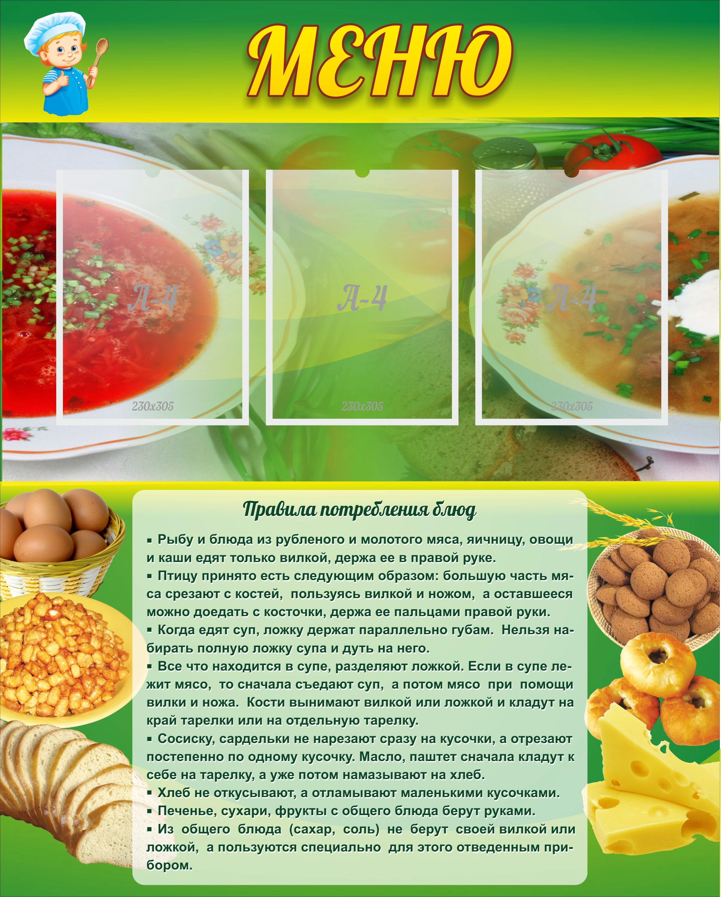 Этот стенд отличается от остальных представленных моделей своим размером, количеством карманов и наличием дополнительной информации. Стенд условно можно поделить на две части. В верхней части размещается заголовок стенда и карманы. В нижней части прописаны основные правила потребления блюд. Таким образом, в верхней строке указано название стенда, а под названием расположены три информационных кармана. В них можно указать перечень блюд, приготовленных детям заботливыми поварами. Стенд рассчитан на ежедневную замену информационных листов, ведь при изготовлении используются только качественные материалы.