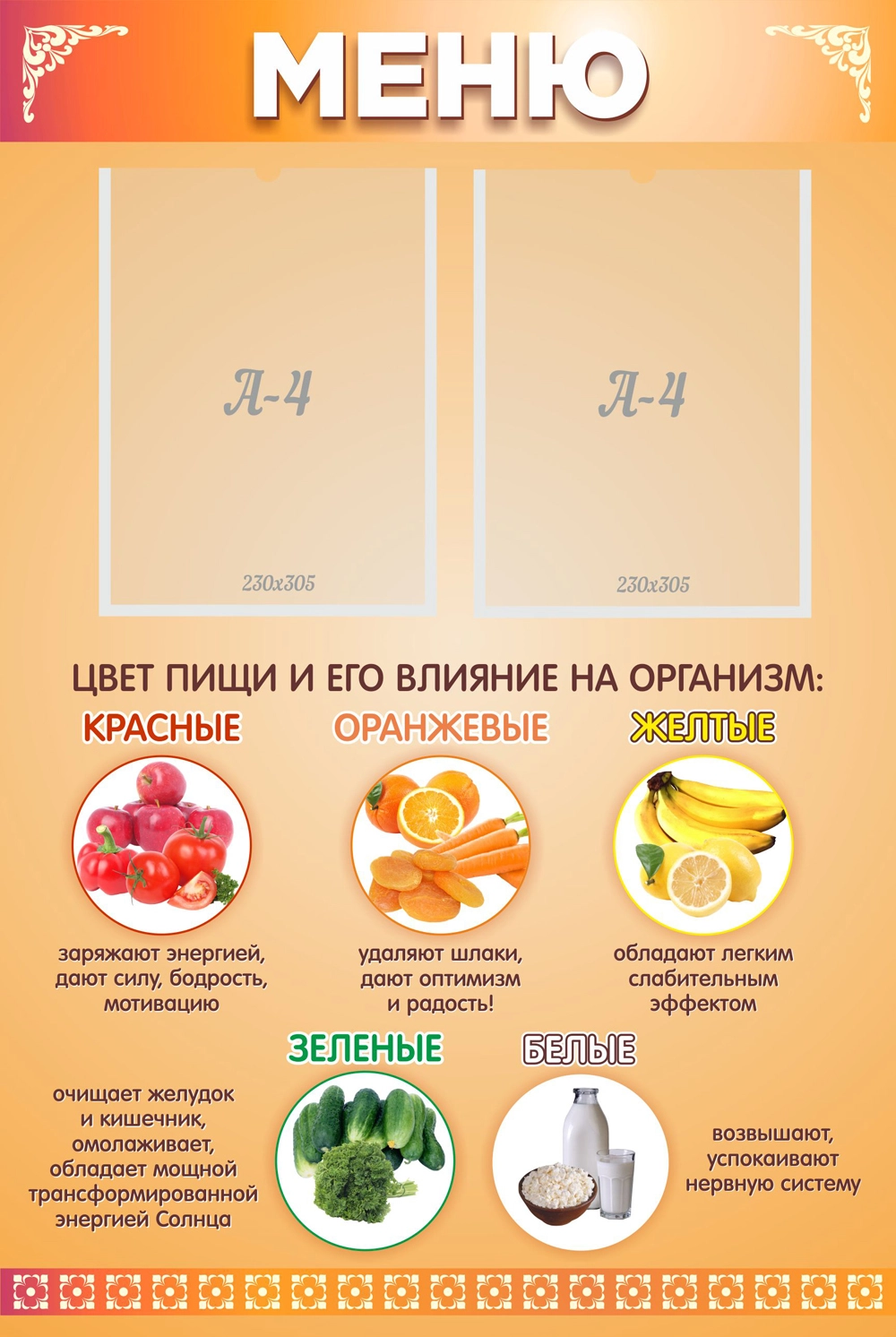 Также на стенде представлена информация, как цвет продукта влияет на организм человека. Ни для кого не секрет, что современные исследования показывают, что для желающих сбросить вес нужно использовать правила питания по цветам.
