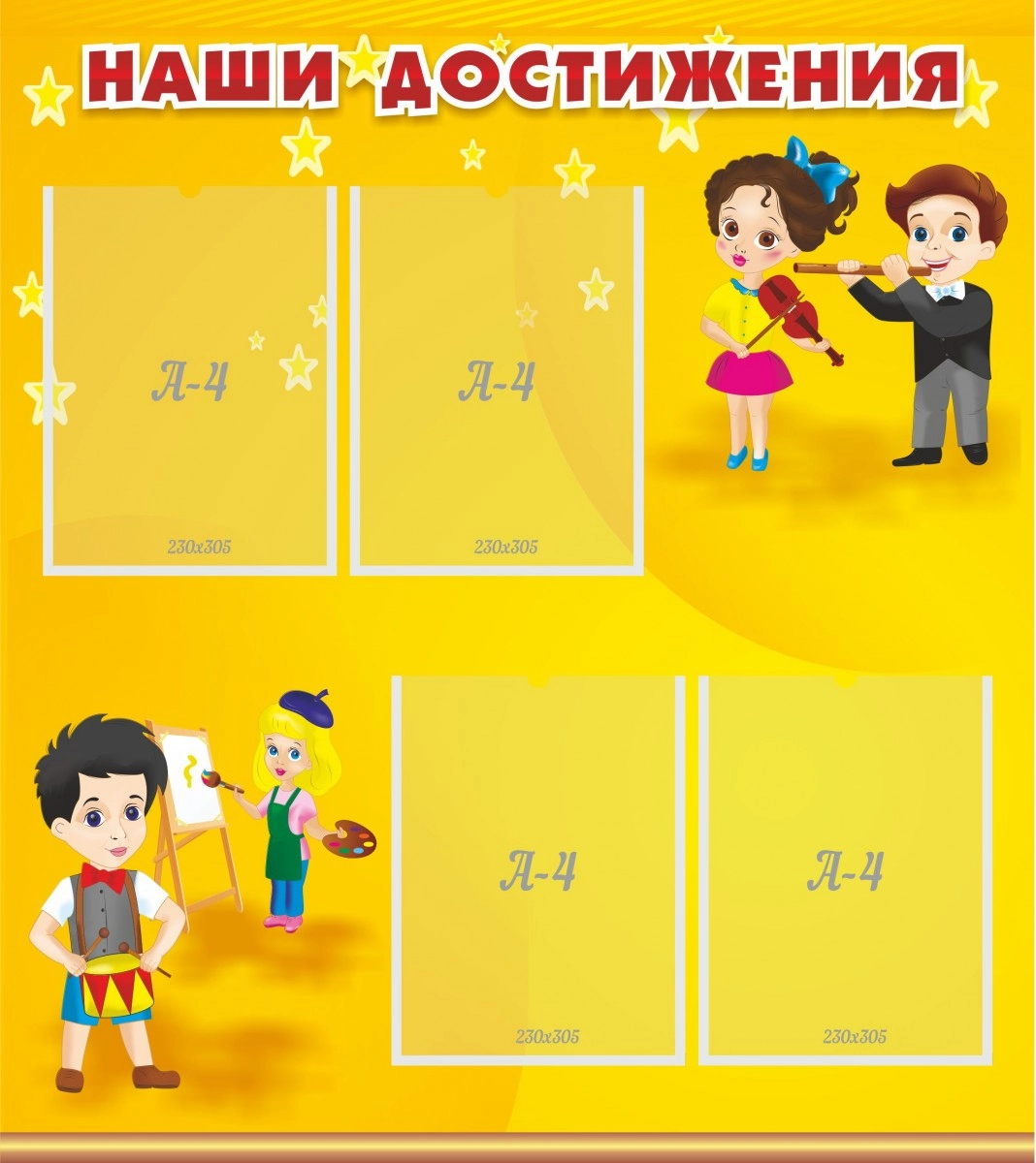 На стенде с 4 карманами ребята смогут помещать свои достижения не только в творчестве. Это могут быть грамоты или похвальные листы, которыми будут гордиться малыши. Такая доска почета должна быть в комнате каждой группы, чтобы дети стремились и достигали новых вершин. Стенд выглядит ярко, красиво и оригинально.
