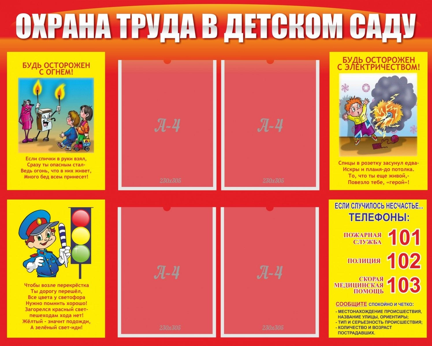 Ключевым элементом данного стенда являются картинки, изображенные на желтом фоне. Возможно свободное расположение материала в информационных карманах, которые находятся в центральной части стенда.
