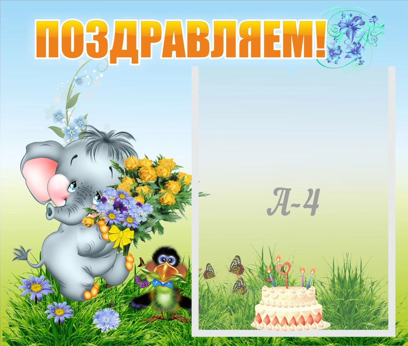 Слоненок спешит поздравить с праздником и желает подарить букет цветов. Малышам понравится дизайн этого стенда. Особенно их повеселит необычная птичка, с маленьким цветочком в клювике. Через этот стенд можно поздравить именинников с днем рождения, родителей и воспитателей с праздниками. Все зависит от фантазии взрослых, ведь создать для детей праздник очень просто! А красиво поздравить с праздником поможет наш стенд.