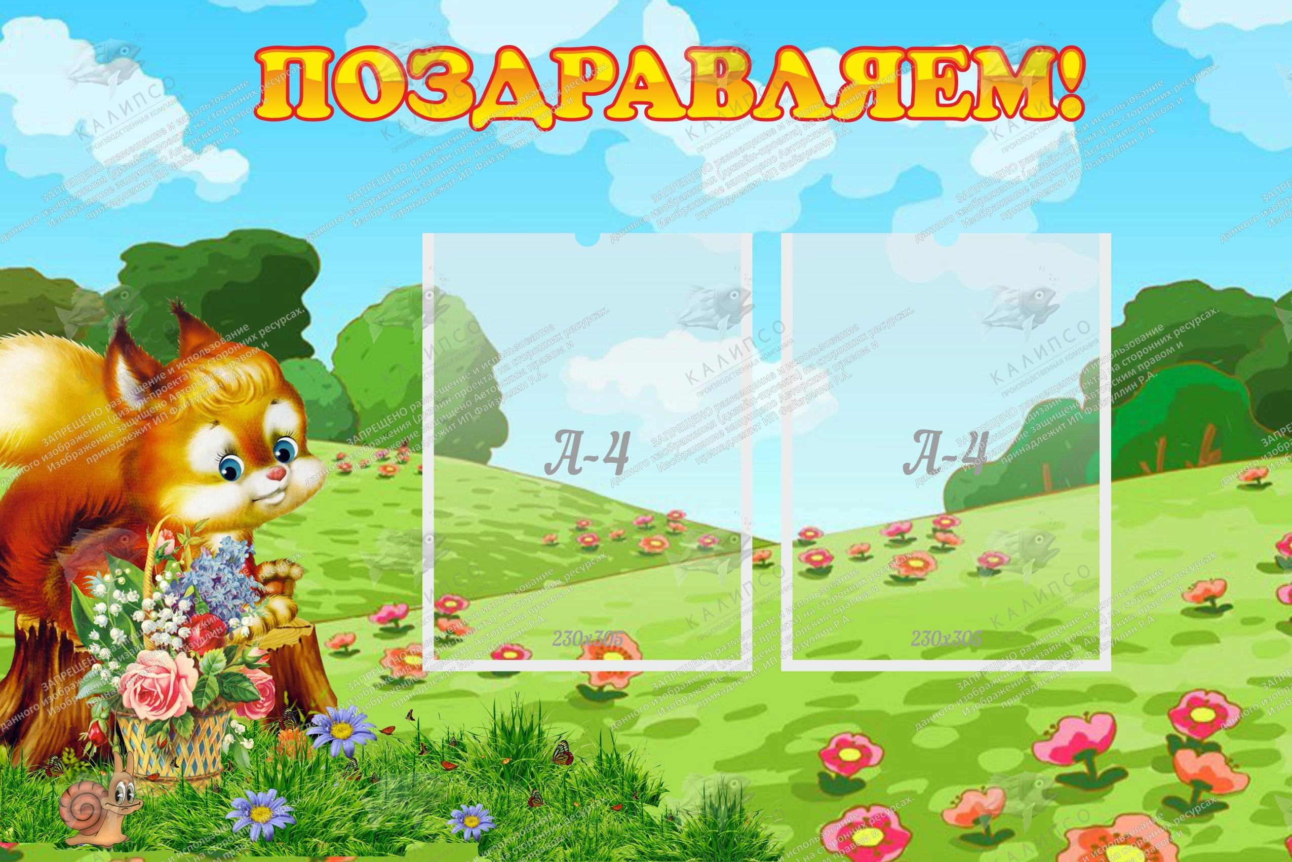 Бельчонок спешит поздравить с праздником и желает подарить букет цветов, который он собрал на лугу. Малышам понравится дизайн этого стенда. Через него можно поздравить именинников с днем рождения, родителей со всевозможными праздниками, а также воспитателей с 8 Марта. Все зависит от фантазии взрослых, ведь создать для детей праздник очень просто! А красиво поздравить с праздником поможет наш стенд.