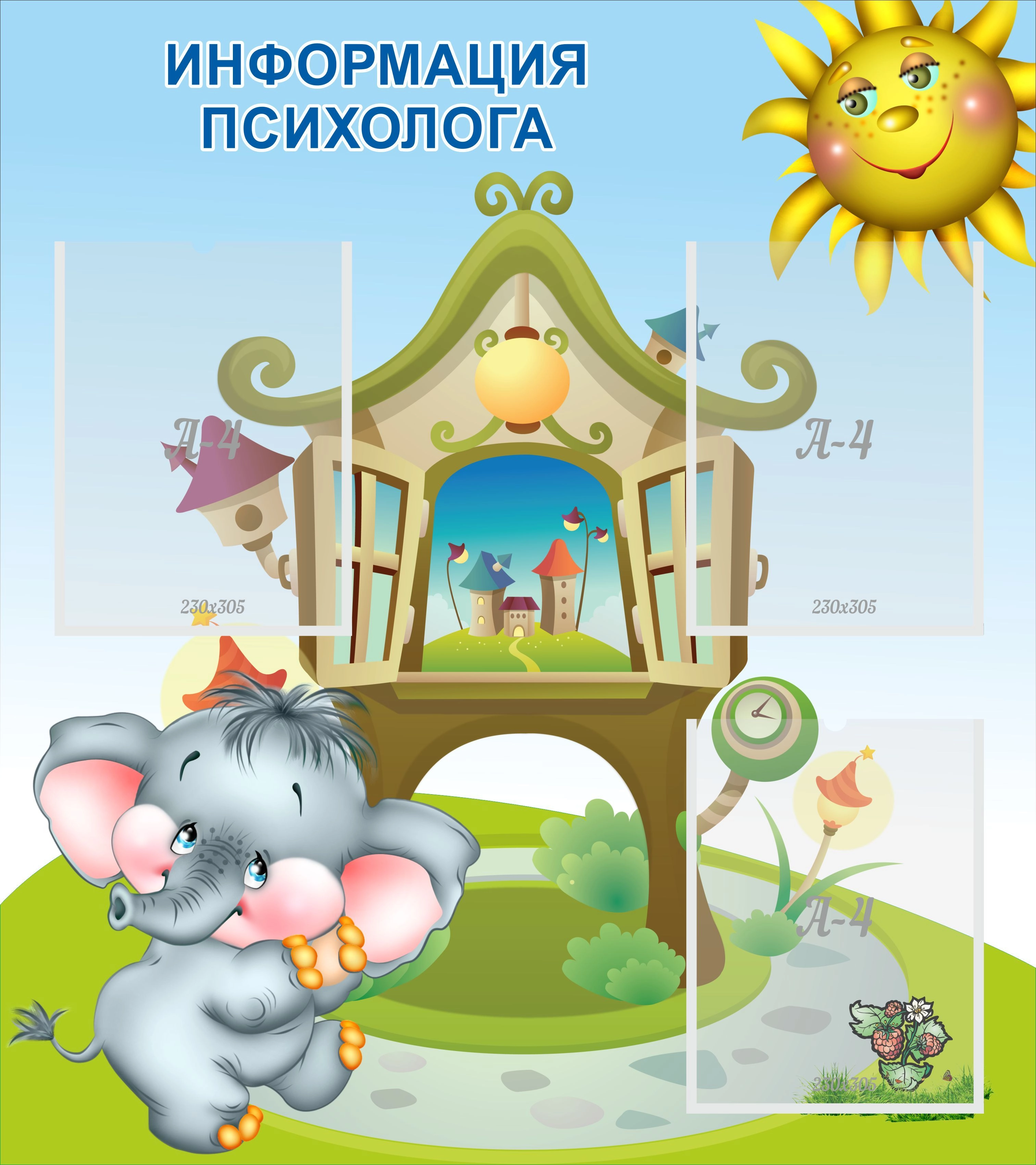 Веселый слоник на стенде заинтересует малыша, пока мама будет изучать рекомендации психолога, удобно расположенные на стенде. Цветовая гамма представленного образца спокойная, расслабляющая. Замена информационного листа проходит очень просто: достаточно потянуть за левый уголок листа, расположенного в кармашке.