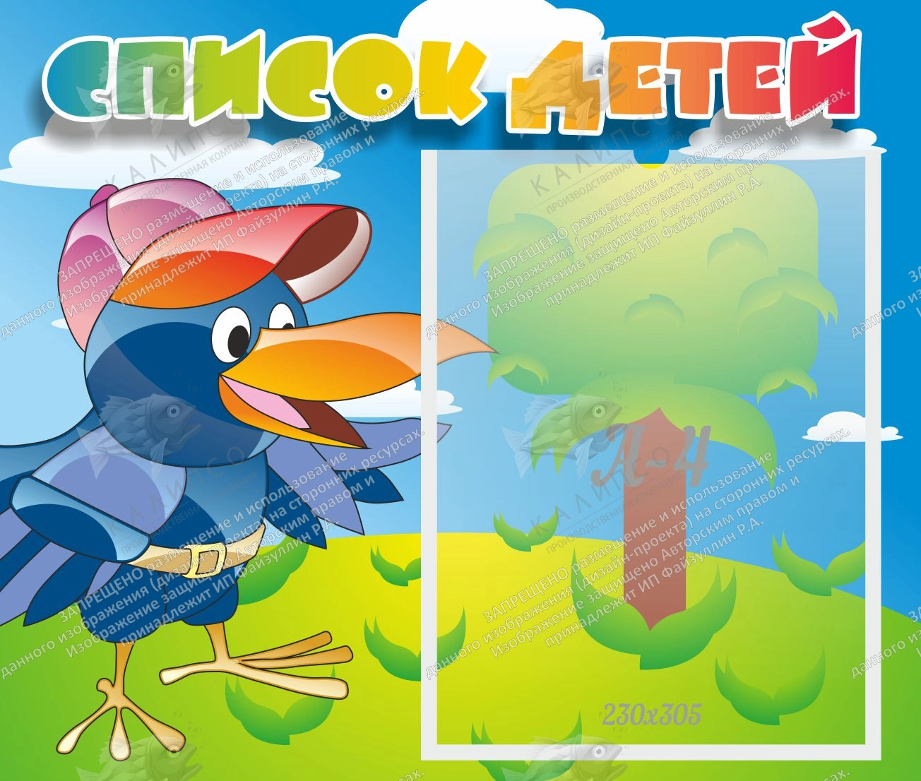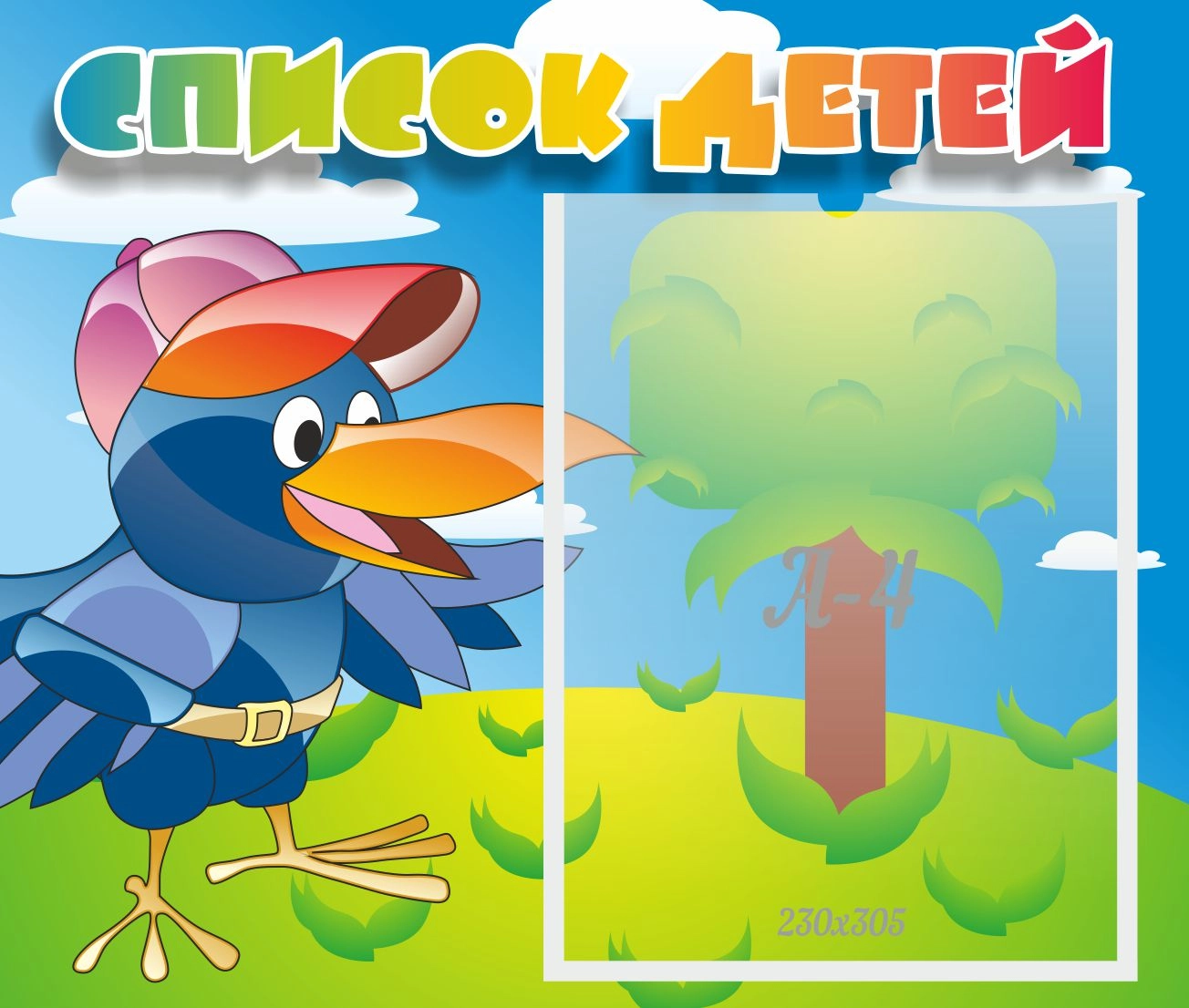 Всегда важно держать под рукой список собственной группы. Но листик со списком может потеряться или дети могут его случайно порвать. Тогда на помощь приходит настенный стенд, который удобно монтировать над столом воспитателя. Веселая ворона в модной кепке расскажет ребятам, что лист на этом стенде – важный документ, и что его нельзя портить. Замена списка группы происходит достаточно легко. Информационный карман имеет срезанный верхний правый уголок. Рисунком для фона выбрана поляна и большой зеленый дуб. Название стенда выполнено большими заглавными буквами, в гамме от синего цвета к красному.