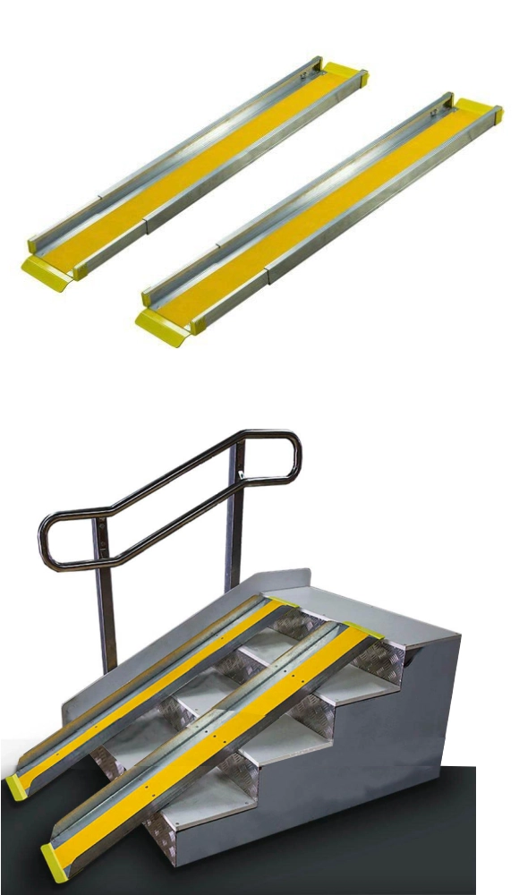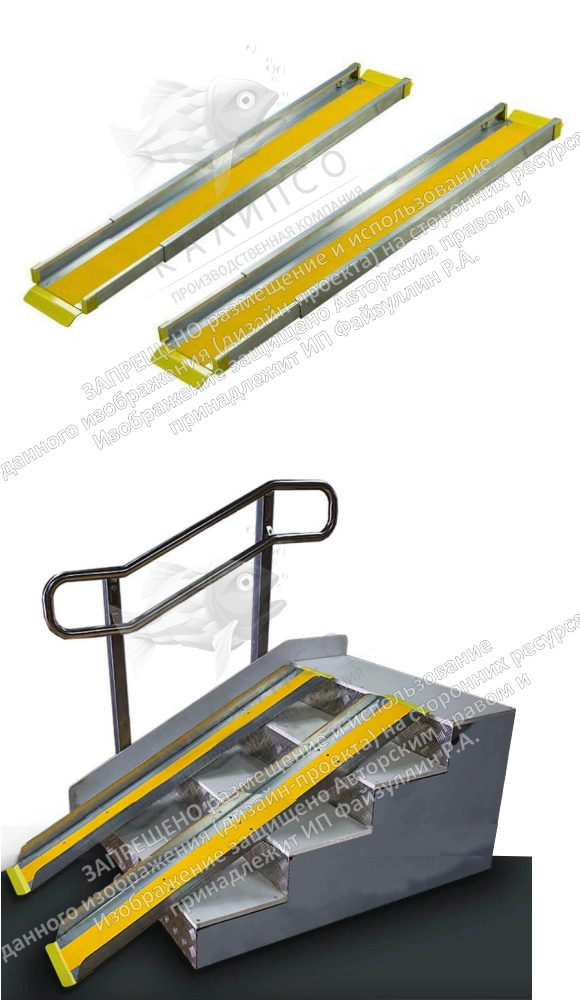 Пандус переносной двухсекционный для кресел-колясок, телескопический, выполнен из анодированного алюминия с нанесением противоскользящего покрытия.