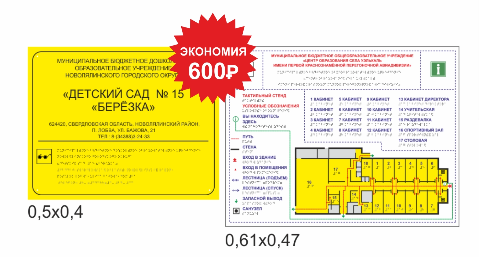 Комплект состоит из мнемосхемы 0,61*0,47 м. и тактильной вывески 0,5*0,4 м.