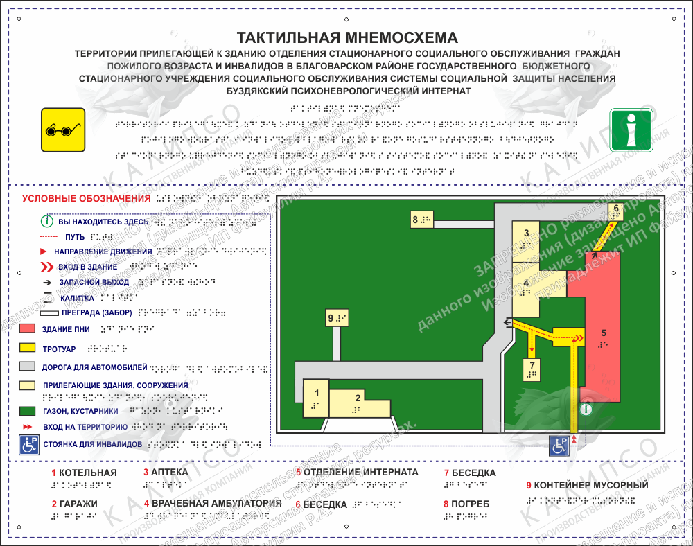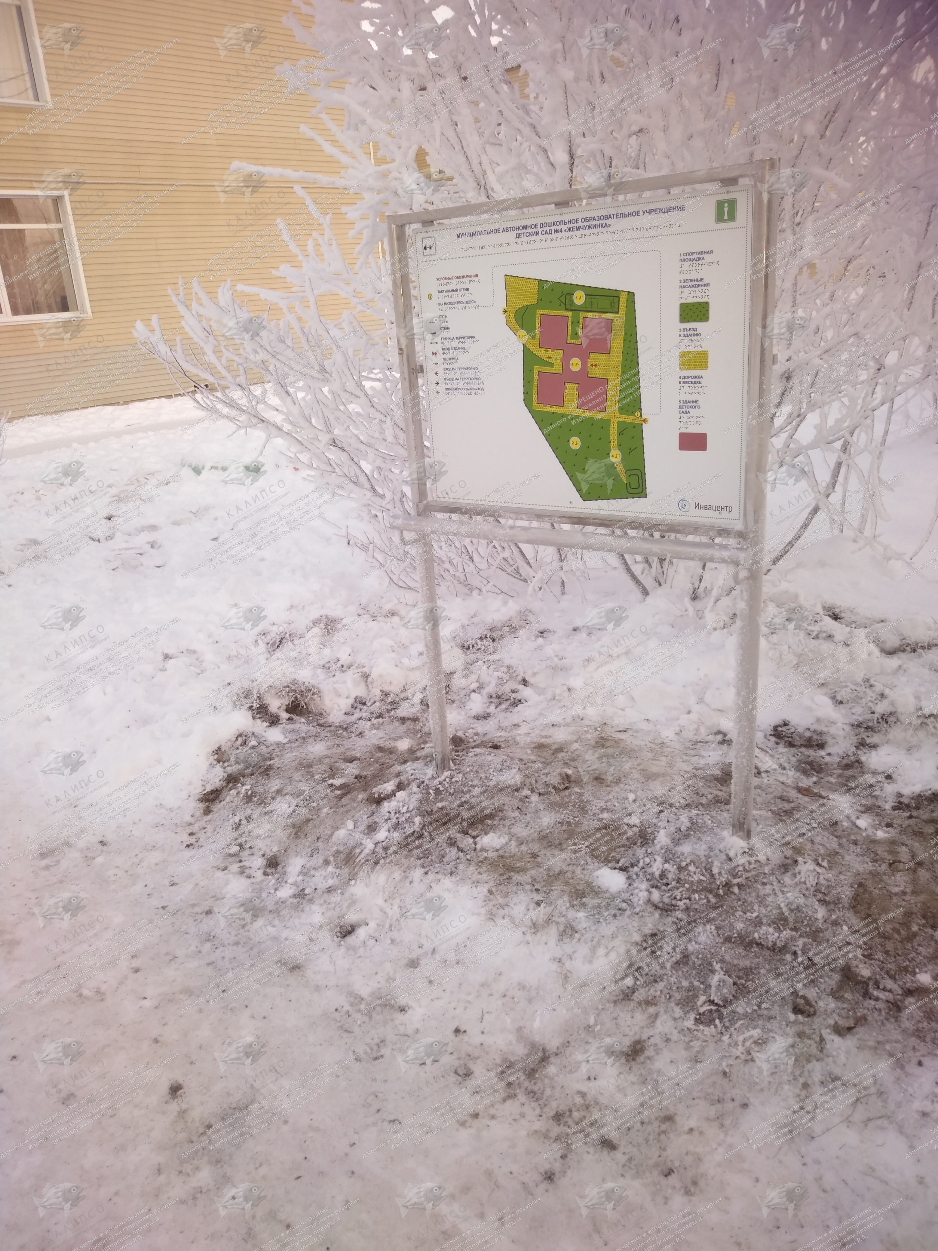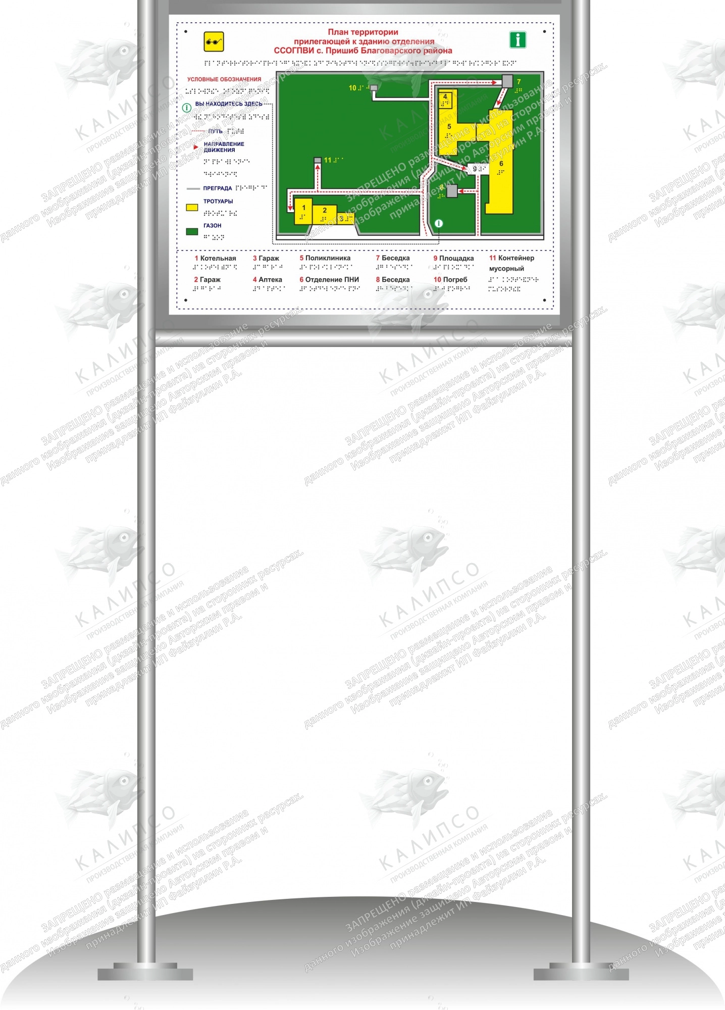 Материал конструкции - сталь нержавеющая марки AISI 304, Размер: 1885*970 мм. Опорный поручень - наличие. Материал информационного поля: композит алюминия, с нанесением рельефного шрифта, высота изображения 0,7 мм. Размер информационного поля: 0,8х0,63 м.