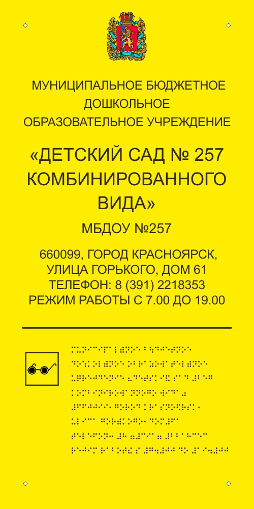 Перед центральным входом в здание должна быть установлена вывеска с тактильной информацией с наименованием учреждения, графиком работы, а так же содержать информацию о назначении и соответствующего учреждения или службы для людей с инвалидностью по зрению.