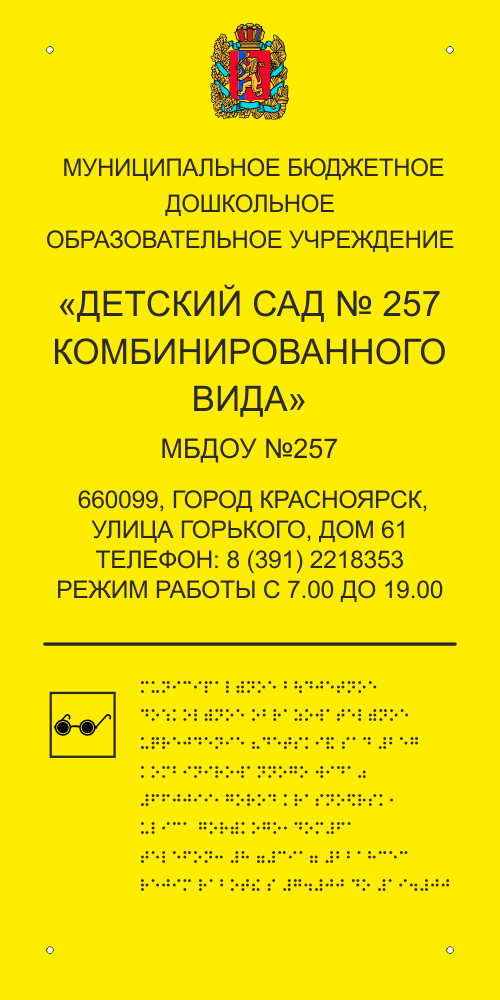 Соответствует федеральной программе «Доступная Среда» и рекомендациям ВОС (Всероссийское общество слепых). Вывеска должна быть освещена. Высота расположения вывески тактильной информации 1,2-1,6 м.