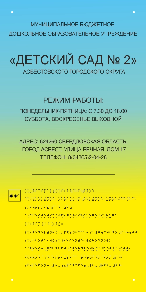 Перед центральным входом в здание должна быть установлена Вывеска с тактильной информацией с наименованием учреждения, графиком работы, а так же содержать информацию о назначении и соответствующего учреждения или службы . Вывеска должна быть освещена. Высота расположения вывески тактильной информации 1,2-1,6 м.