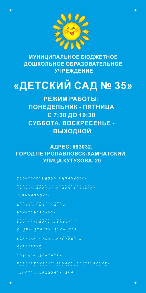 Перед центральным входом в здание должна быть установлена Вывеска с тактильной информацией с наименованием учреждения, графиком работы, а так же содержать информацию о назначении и соответствующего учреждения или службы. Вывеска должна быть освещена. Высота расположения вывески тактильной информации 1,2-1,6 м.