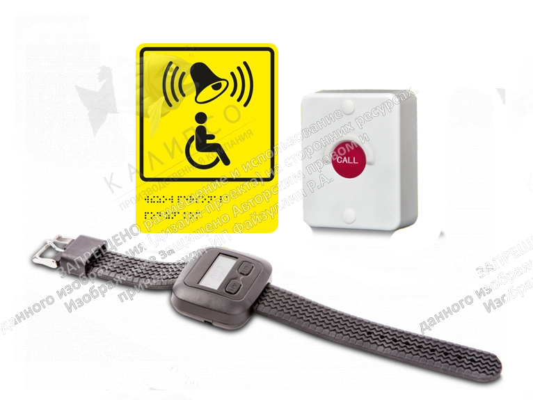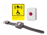 Комплект включает в себя: кнопку вызова для инвалидов iBells 309, наручный пейджер iBells 203 и табличку для инвалидов.