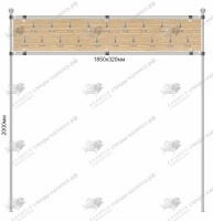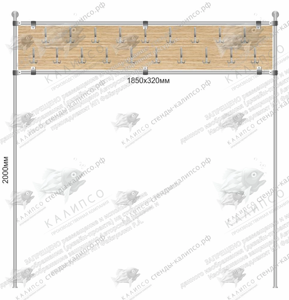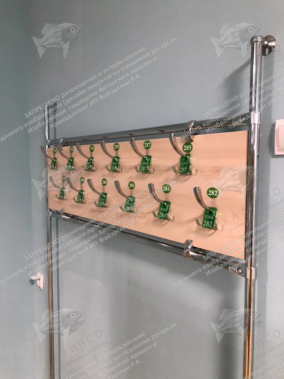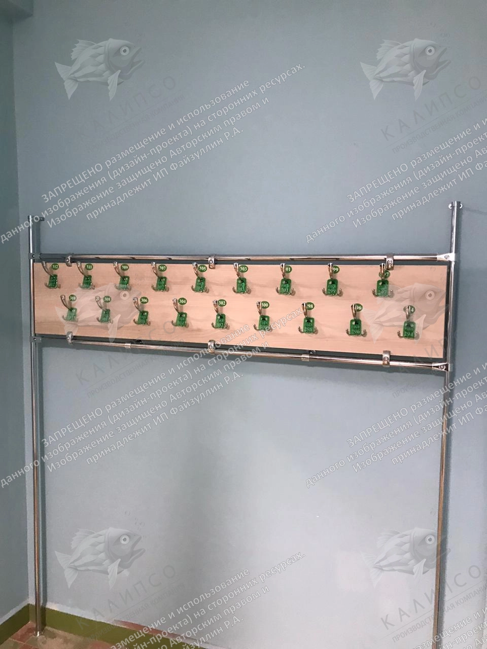 Конструкция вешалки изготовлена из хромированных металлических труб 25 мм. и комплектующих. Основание вешалки выполнено из ЛДСП, на нем размещены 19 тройных крючков.