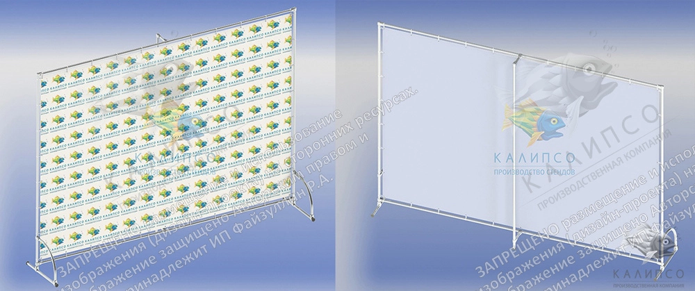 Конструкция изготовлена из систем труб - Джокер. Диаметр трубы 25 мм. Баннер размером 2х3 м, позади баннера размещена опора из вертикальной трубы от провисания баннера. Баннер с фотопечатью 720 dpi, устанавливается на трубы при помощи пластиковых хомутов - через люверсы на баннере.