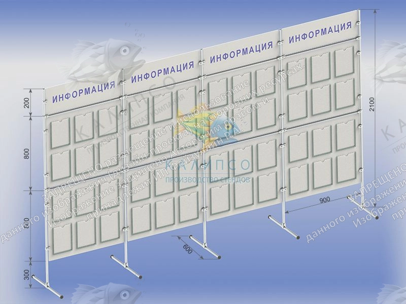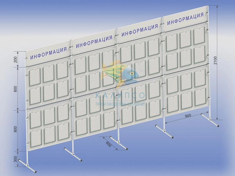 хромированная Joker труба 25 мм, 8 рабочих полей из ПВХ 3 мм. размером 0,8*0,9 м (высота, ширина) с фотопечатью 720 dpi и по 6 карманов формата А4 для информации. 4 верхних поля для названия 0,2*0,9 м. Дизайн стенда разрабатывается по Вашему техническому заданию