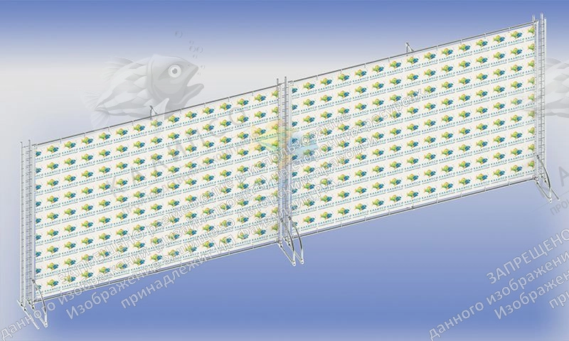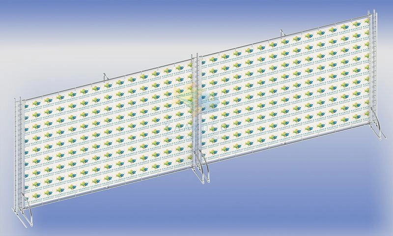 Конструкция изготовлена из систем труб - Джокер и Tritix 3 (связка из четырех труб). Диаметр трубы 25 мм. 2 баннера размером 2,1*3 м (высота ширина). Позади баннера размещена опора из вертикальной трубы от провисания баннера. Баннер с фотопечатью 720 dpi. устанавливается на трубы при помощи пластиковых хомутов - через люверсы на баннере.