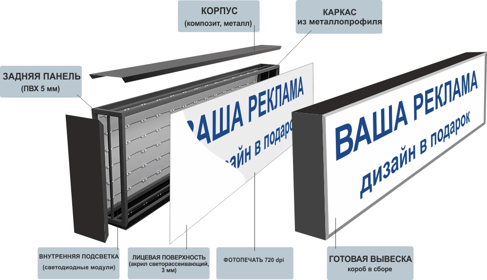 Лицевая поверхность - акрил светорассеивающий 3 мм, фотопечать 720 dpi