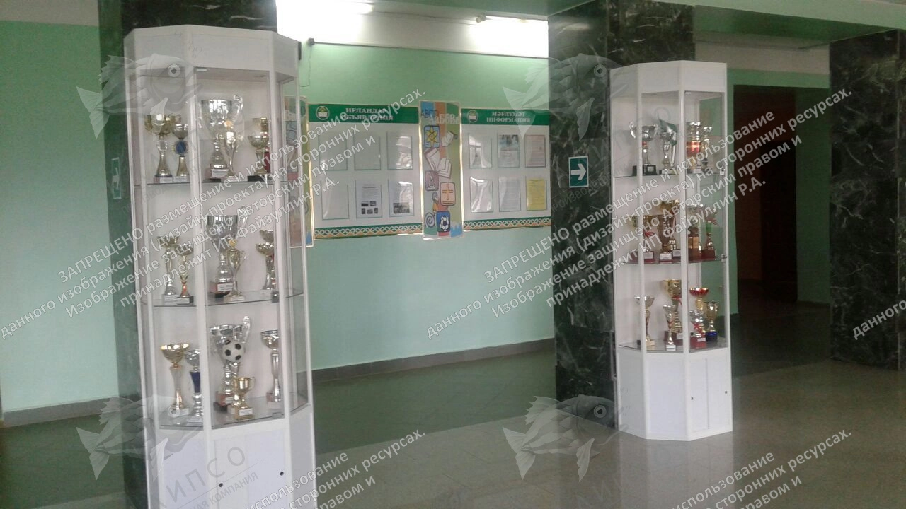 В верхней части витрины расположены 2 светильника со светодиодными лампами. В таком шкафу-витрине можно поставить редкие книги, карты, глобусы, кубки. Также прозрачное стекло позволит разместить в шкафу детские рисунки или поделки. Такая модель шкафа идеальна для любого кабинета или же коридора школы.
