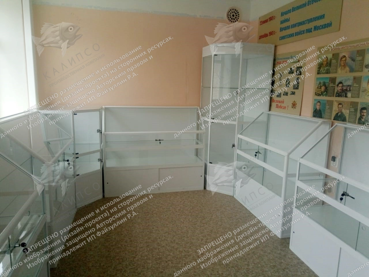 Стенд-витрина выполнен из алюминиевого профиля, полки из минерального стекла -5 мм, дверцы и боковые стенки из минерального стекла - 4 мм, с бронированием пленкой 112 мкм.