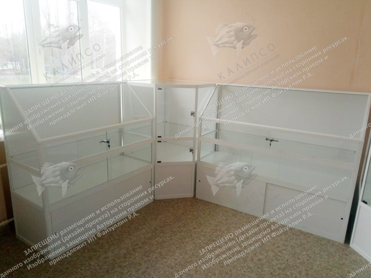 Стенд-витрина выполнен из алюминиевого профиля, полки из минерального стекла - 6 мм, дверцы и боковые стенки из минерального стекла - 4 мм, с бронированием пленкой 112 мкм.