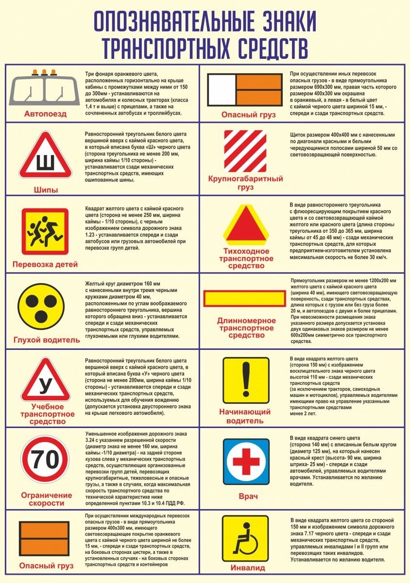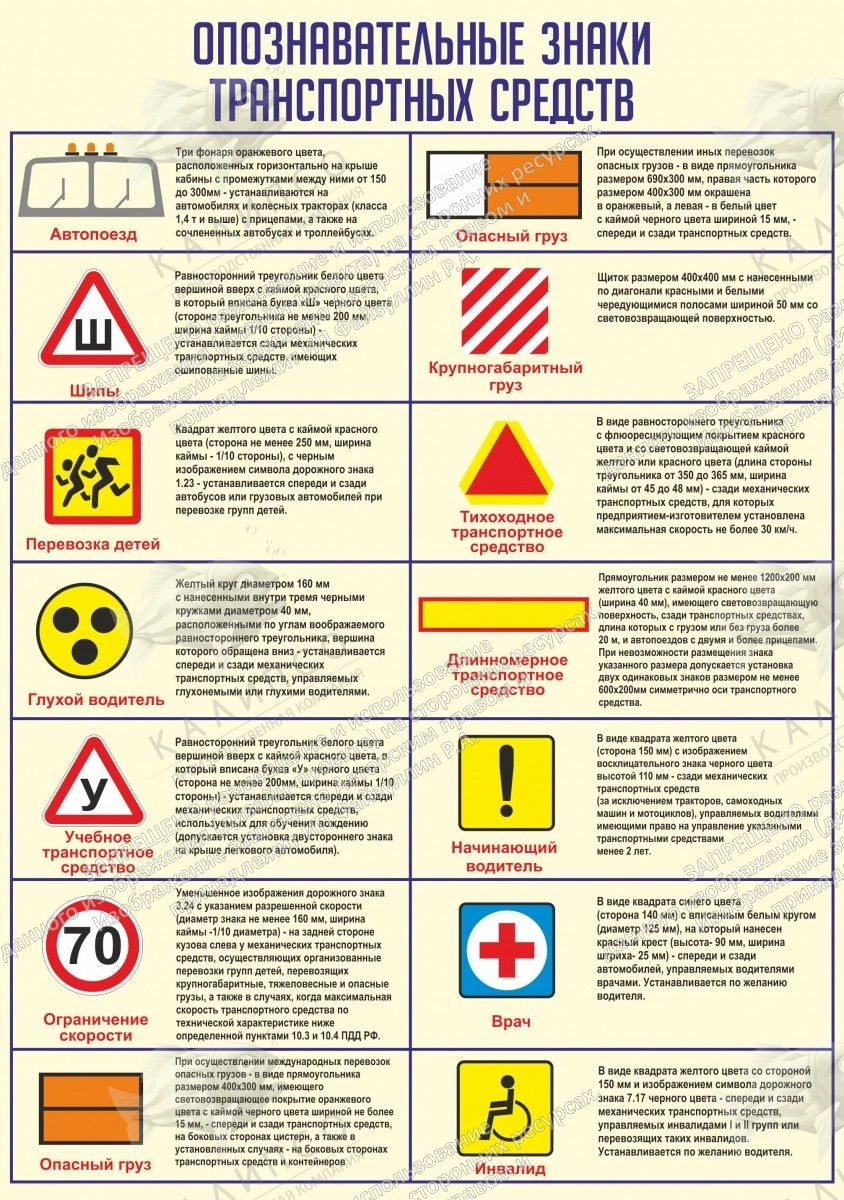 Дети должны знать основные обозначения, которые размещаются на транспортных средствах. Очень часто эту информацию изучают только в автошколе. Каждый ребенок, должен понимать, что значит красный плюсик в синем квадрате и три черных маленьких кружочка в большом желтом круге. Нужно подготовить ребенка, как он должен вести себя при виде автопоезда или длинномера с опасным грузом. Или как реагировать при виде учебного транспортного средства. Данный стенд в информативной форме рассказывает о них. Он выполнен из пластика и может быть использован как в общеобразовательных, так и автошколах.