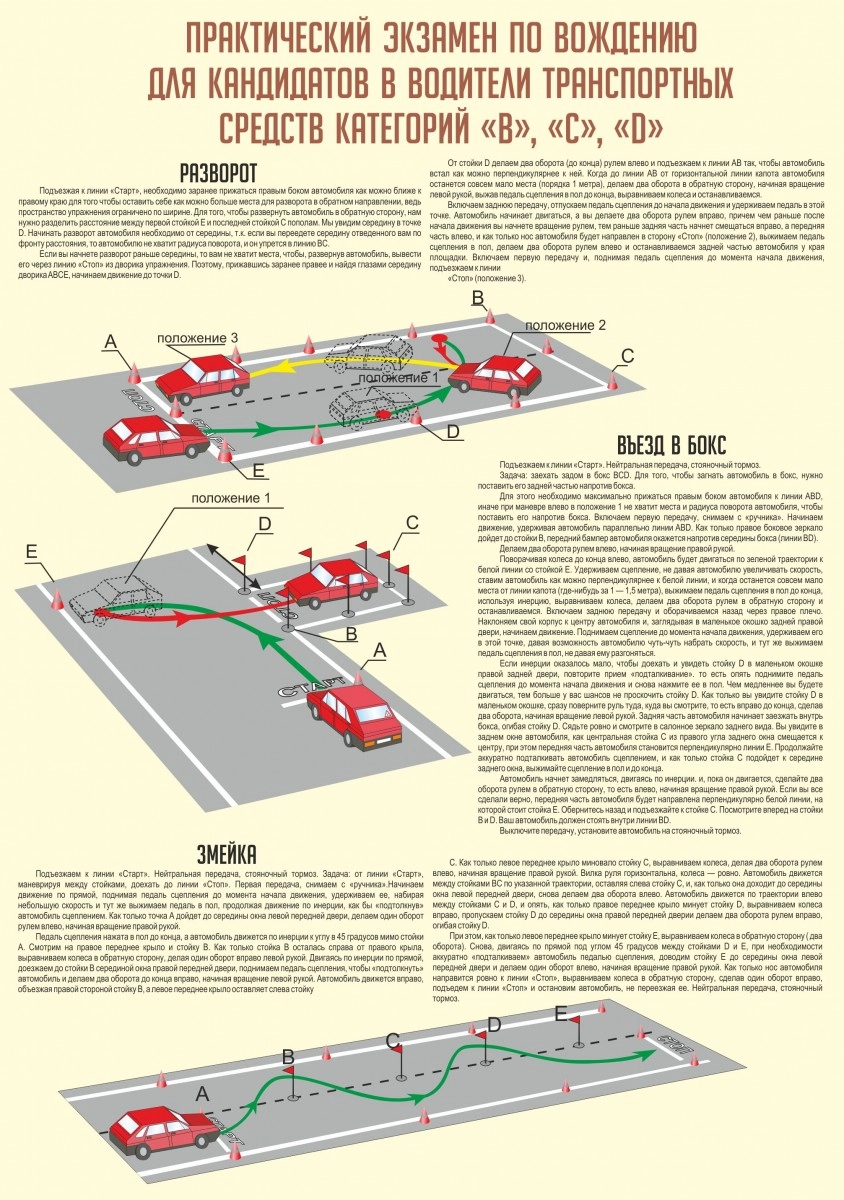 Изучение курса вождения транспортного средства заканчивается сдачей экзамена. Особый страх у курсантов вызывает экзамен по практике вождения. Как правило, на экзамене они забывают даже то, что знали наверняка. Этот стенд лучше приобретать вместе со стендом ШК-3509, так как они являются дополнением друг друга. На этом стенде показан другой вариант задания, включающий разворот, въезд в бокс, а также змейку. Эти задания обычно предназначаются самым активным ученикам автошколы. Экзаменаторы считают, что если по окончании курса, ученик сможет это сделать, то это будет считаться высшим пилотажем в вождении.