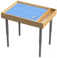 Столик представляет собой короб-планшет на телескопических ножках с подсветкой 3-цветными светодиодными матрицами, обеспечивающими большое разнообразие цветов подсветки. В короб насыпается специальный кварцевый песок и распределяется равномерным слоем по матовому безопасному стеклу. Если на песке что-нибудь нарисовать – рисунок снизу будет подсвечен разными цветами. Электронный блок обеспечивает выбор цвета подсветки и набор программ. Управление режимами подсветки производится с кнопочного радиопульта. Возможен выбор одного из 8-ми цветов, а также выбор динамических программ с управлением скоростью изменения цветов. Доступно также управление яркостью подсветки.