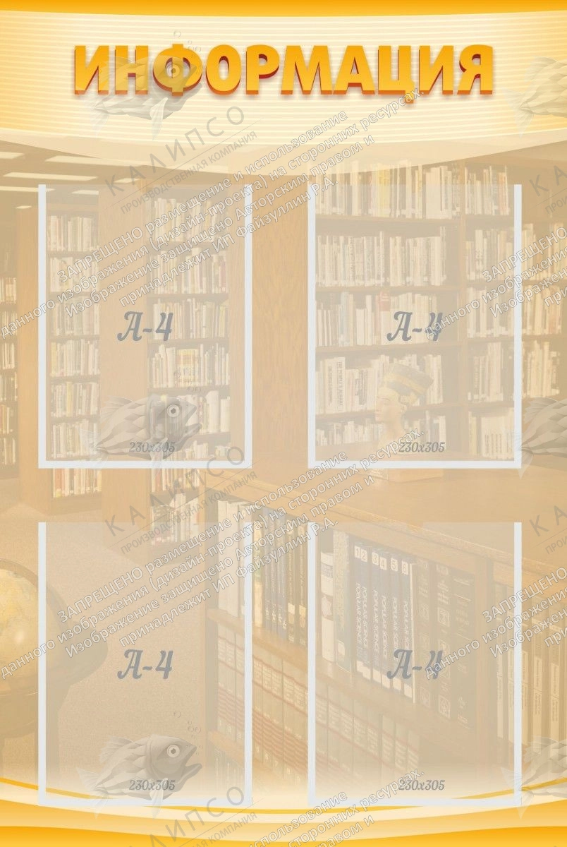 Как часто дети не соблюдают дисциплину в библиотеке не потому, что делают это специально, а потому что не знают основных правил поведения в ней. На таком стенде можно поместить информацию с правилами поведения в библиотеке, ознакомить с персоналом библиотеки, с правилами пользования книгами и т.д. На стенде нанесено изображение библиотечных стендов, что призывает школьников содержать книги в порядке и определенной последовательности. Стенд небольшого размера, поэтому он будет привлекать внимание посетителей библиотеки, в том числе и в очереди за желаемой книгой. Стенд оборудован четырьмя удобными карманами для размещения информации.