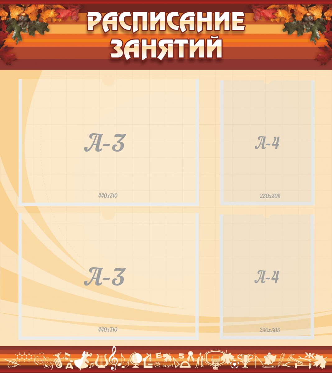 Ни один коридор школы не может обойтись без расписания уроков. Все мы хорошо помним эту большую таблицу со списком классов и времени уроков, которую постоянно приходилось прятать в файл. Теперь для расписания можно выделить большой и красивый стенд. Информация на нем будет легко читаться, благодаря отсутствию на стенде ярких рисунков, узоров и цветов. На стенде «расписание уроков» имеются 2 кармана для горизонтального размещения листов формата А3. Справа на стенде есть 2 кармана для листов А4, в них можно разместить информацию о внесении изменений в расписание уроков, или же расписание звонков.