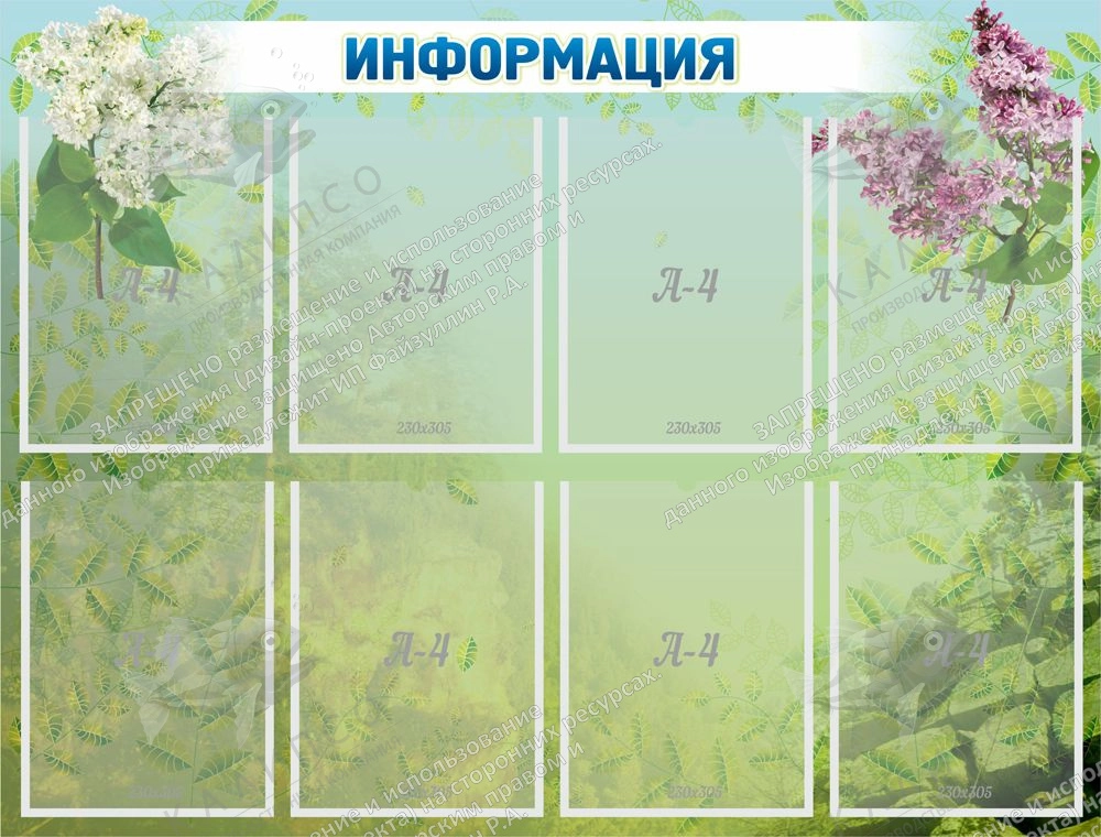 Оригинальная модель стенда для размещения информации теперь доступна каждому. Красивые тона и изображенные ветки сирени делают стенд уникальным, а наличие 8 карманов придают ему многофункциональность. На таком стенде можно повесить не только информационные листы, но и объявления или грядущие мероприятия. В карман помещается вертикальный лист формата А4. Также карман имеет удобную для изъятия листов форму. Такой стенд поднимет настроение и улучшит атмосферу в любом коридоре школы. Дизайн стенда по желанию можно изменить, но он не потеряет своего качества и насыщенности красок.