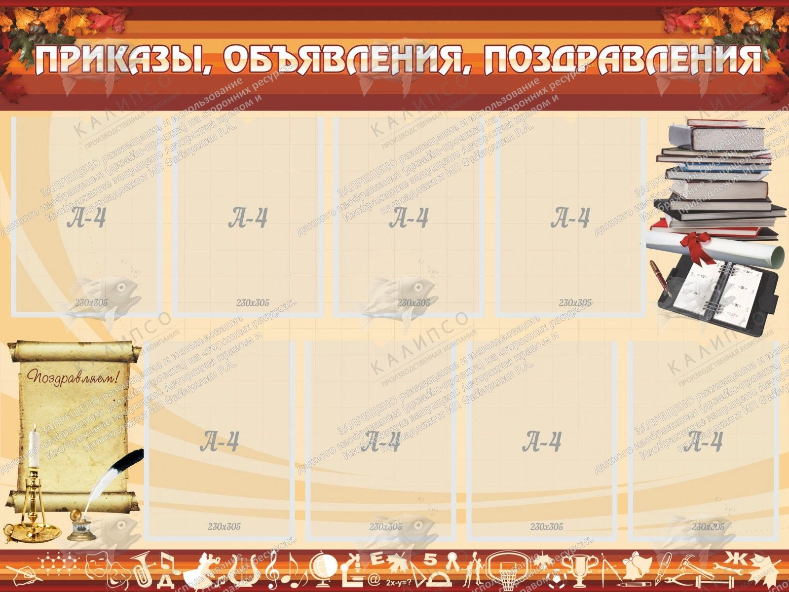 Данная модель стенда является очень удобной, так как предназначен для размещения приказов, объявлений и поздравлений. Для этого на стенде имеются 8 карманов формата А4.