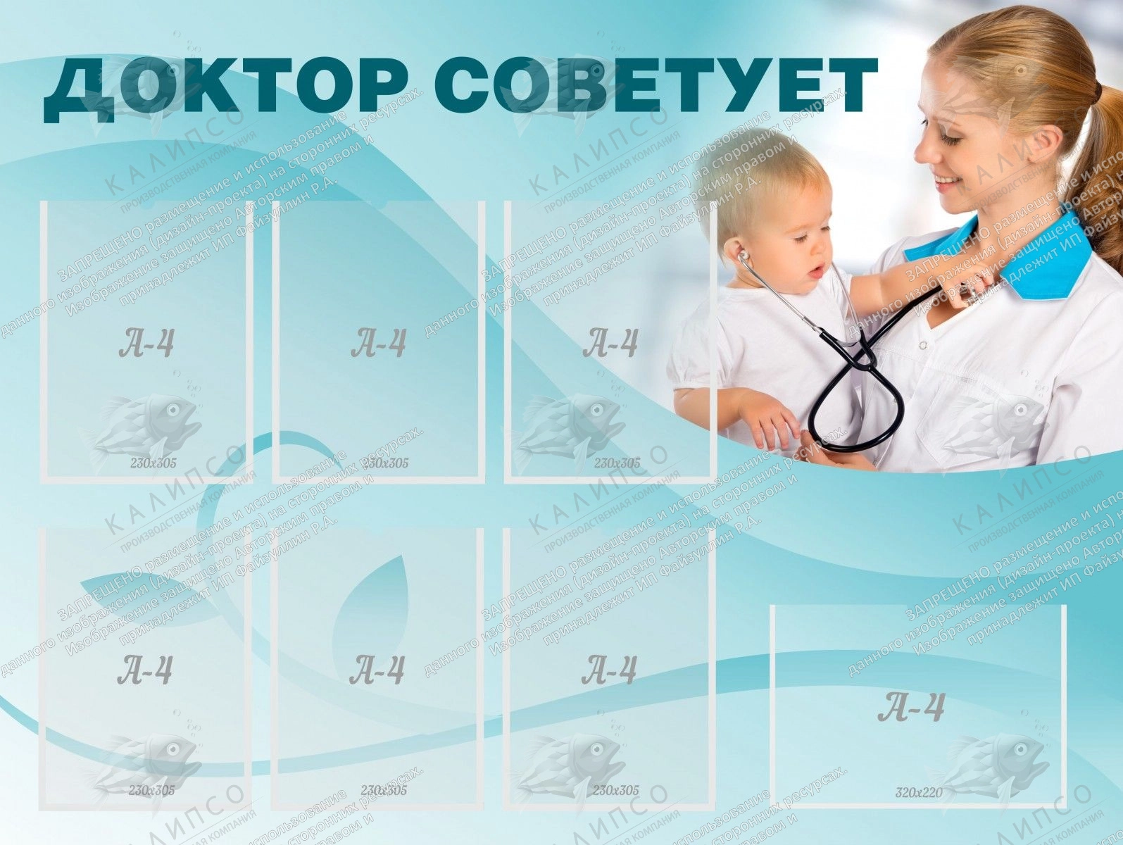 Сохранность здоровья является одной из главных проблем современного общества. Поэтому нужно обращать внимание на проблемы со здоровьем, которые могут быть у детей разного возраста. Такой стенд предназначен для медпунктов. Он предлагает разместить в форме советов и рекомендаций, как себя вести во время болезни, что сделать, чтобы не заболеть и т.п. На стенде предусмотрено шесть стандартных ячеек и одна ячейка большого формата для объемной информации. В этой ячейке, например, можно представить большое схематическое изображение какого-то органа человека. Приятный неагрессивный голубой фон способствует спокойному изучению информации.