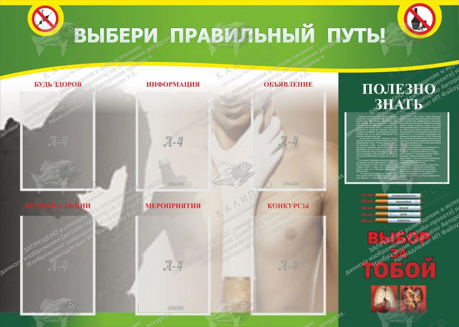 Каждый курильщик в детстве слышал от своих родителей, что курение вредит здоровью. Но все равно начинал курить, даже осознавая истинный вред от сигарет. Этот стенд в основном размещают в медпунктах. Он призван обратить внимание детей на проблему курения и предостеречь от возможных последствий со здоровьем. Этот стенд должен быть «живой». В нем должна постоянно меняться информация, чтобы он привлекал к себе внимание. Стенд оборудован шестью стандартными карманчиками с фиксированными целевыми назначениями. Седьмой карманчик представляет собой информативную заметку «полезно знать».