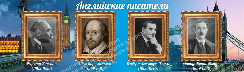 Большинство людей мечтают прочитать любимую книгу в оригинале. Этому помогает изучение иностранного языка. На необычном фоне данного стенда изображены известные портреты английских классиков: Рерьярда Киплинга, Уильяма Шекспира, Герберта Джорджа Уэллси и Артура Конан Доила. Так же представлены их годы жизни. Этот стенд впишется в интерьер любого класса. В его строение входит ПВХ-пластик, пленка с фотопечатью и ламинирующая пленка, что поможет данному стенду прослужить долгие годы, буквы не поблекнут, а краска не начнет сыпаться, что, безусловно, еще один плюс данного стенда.