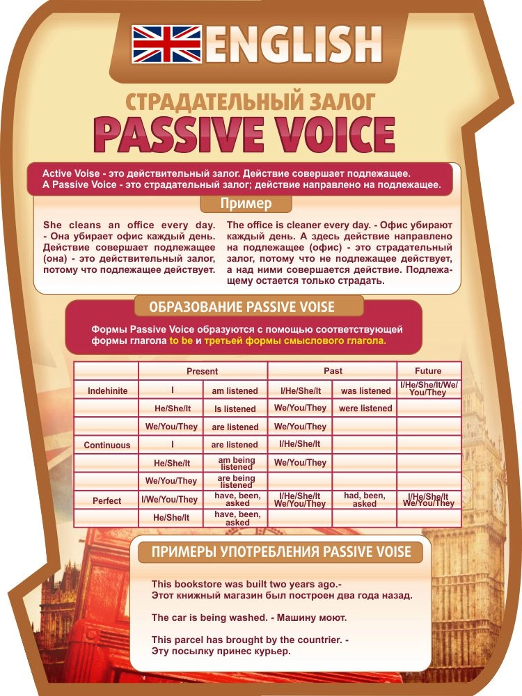 Настенное наглядное пособие в виде резного стенда напомнит ученикам о правилах употребления страдательного залога в английском языке.