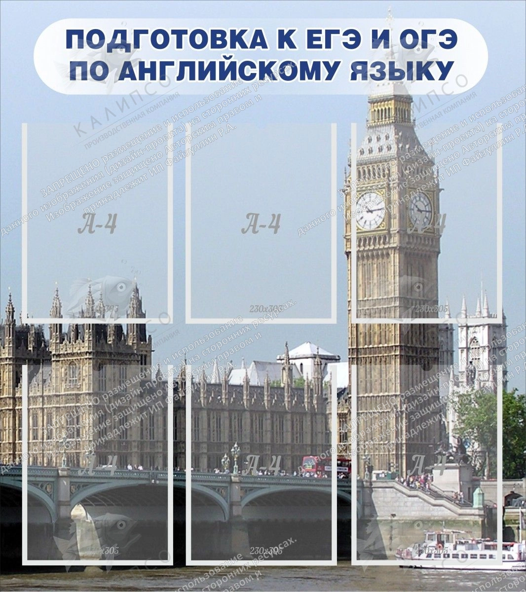 Многие ученики для сдачи экзамена из предметов выбирают английский язык. На этом стенде есть шесть кармашков А4 (хотя чаще всего на стендах не более четырех), куда учитель сможет разместить всю интересующую информацию для выпускников девятых и одиннадцатых классов, чтобы они не могли пропустить изменения в форме экзамена, смогли найти справочный материал и посмотреть варианты экзамена. На фоне изображен Биг-Бен, показывая тем самым ученикам, что совсем скоро экзамен и расслабляться не следует. Качество стенда на очень высоком уровне, и поэтому краска не поблекнет со временем, буквы не сотрутся, а сам стенд сохранит первоначальный вид долгое время.