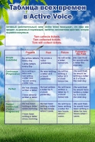 Большинство людей, когда начинают изучение английского языка, путаются во временах. Так как в английском языке шестнадцать времен, каждое из которых имеет свое правило, свое исключение, свои сигнальные слова. В данной таблице ученик сможет увидеть примеры для каждого из времен, что поможет ему побыстрее разобраться со временами и понять, в каких случаях употреблять глагол в том или ином времени. Также на стенде присутствует информация о активном залоге, прилагая к нему примеры. Спокойный и умиротворяющий фон данного стенда настраивает учеников на учебу.