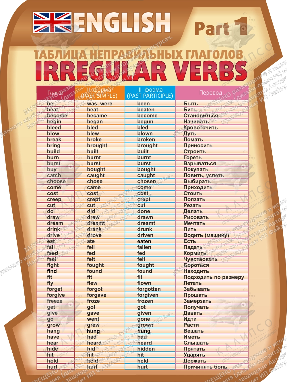 Первый стенд из серии в виде трех наглядных настенных пособий рассказывает о правописании неправильных глаголов в начальной форме, в Past Simple и в Past Participle. Примеры слов расположены в алфавитном порядке, первая таблица вмещает в себя слова, начинающиеся на букву b, и заканчивается словами, начинающимися на букву h. Имея под рукой такие яркие и качественные наглядные пособия, ученики гораздо быстрее запомнят написание и произношение ключевых неправильных глаголов, а если всё-таки на какой-нибудь контрольной работе получится заминка, стенд поможет быстро восстановить забытые знания. Серия стендов, делящая стандартный список неправильных глаголов на 3 части, изготовлена из качественного пластика. Понятная калибровка информация, приятная цветовая гамма, дизайн в виде полураскрытого свитка - что может быть лучше для оснащения современного кабинета английского языка? Звоните и заказывайте прямо сейчас лучшие наглядные пособия для Ваших детей!