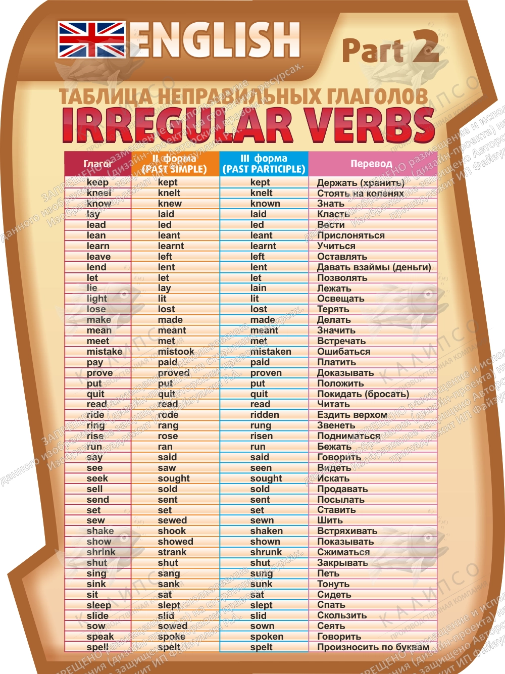 Вторая часть серии наглядных школьных пособий "ТАБЛИЦА НЕПРАВИЛЬНЫХ ГЛАГОЛОВ, ЧАСТЬ 2" подскажет ученикам правописание и русский перевод всех неправильных глаголов в английском языке от буквы K по букву S. Слова представлены в алфавитном порядке - стандартная форма, Past Simple и Past Participle.