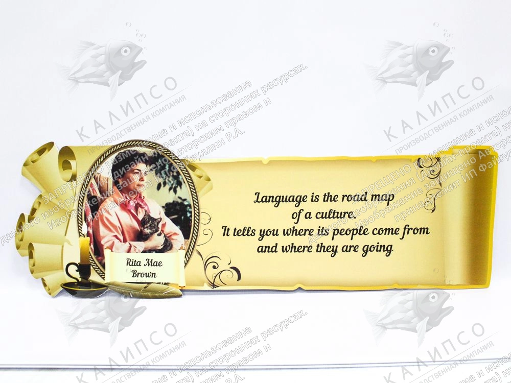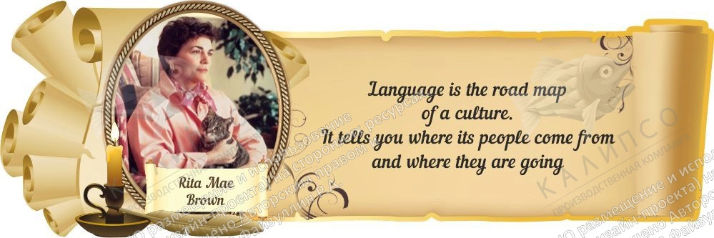 Мотивационный стенд с цитатой романистки Риты Браун научит детей с большим уважением относиться к языку как к социальному явлению. Основная идея высказывания заключается в том, что именно язык общества – это прямое отражение истории его развития и культуры. Именно язык рассказывает о том, "…откуда пришли его люди и куда идут."