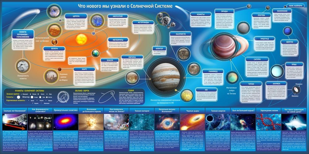 А ещё определение понятий астероиды, Чёрные дыры, Тёмная материя и не только. Если Вы искали по-настоящему интересную наглядность для кабинета астрономии, обратите внимание на широкоформатный настенный стенд о нашей Солнечной Системе. Это увлекательный, очень интересный наглядный материал, благодаря которому школьники быстро и просто расширят свои представления о законах нашей Солнечной Системы, о ее составе, рассмотрят наглядные примеры.