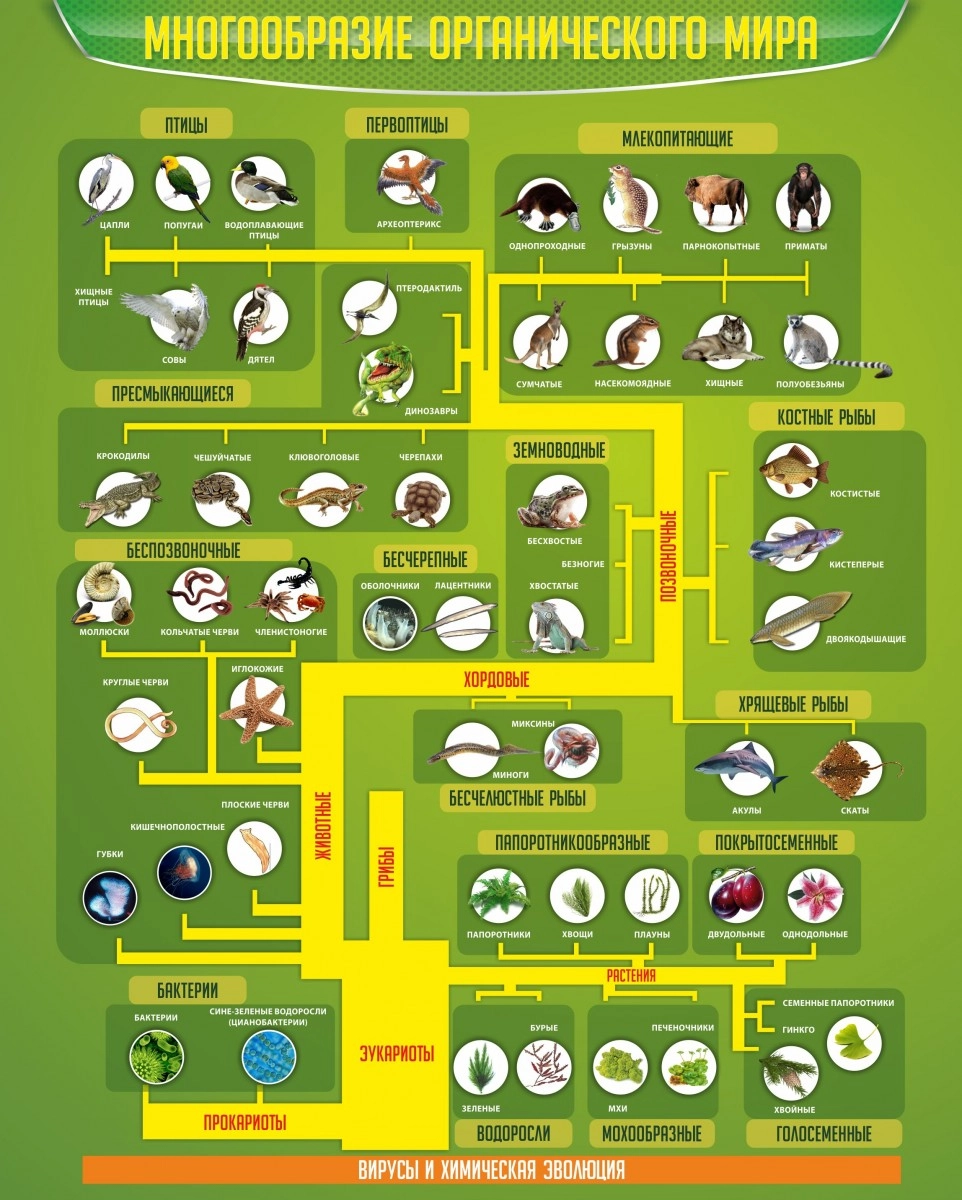 Настенный школьный стенд «ЭВОЛЮЦИЯ ОРГАНИЧЕСКОГО МИРА» от производственной компании «Калипсо» в доступный и понятный схематичный способ расскажет Вашим детям о многообразии органического мира: птицы и первоптицы, млекопитающие и пресмыкающиеся, земноводные и рыбы (костные и хрящевые), беспозвоночные и хордовые. А также эукариоты, водоросли, растения все основные понятия темы «Органический мир» в компактном порядке расположены на представленной схеме.