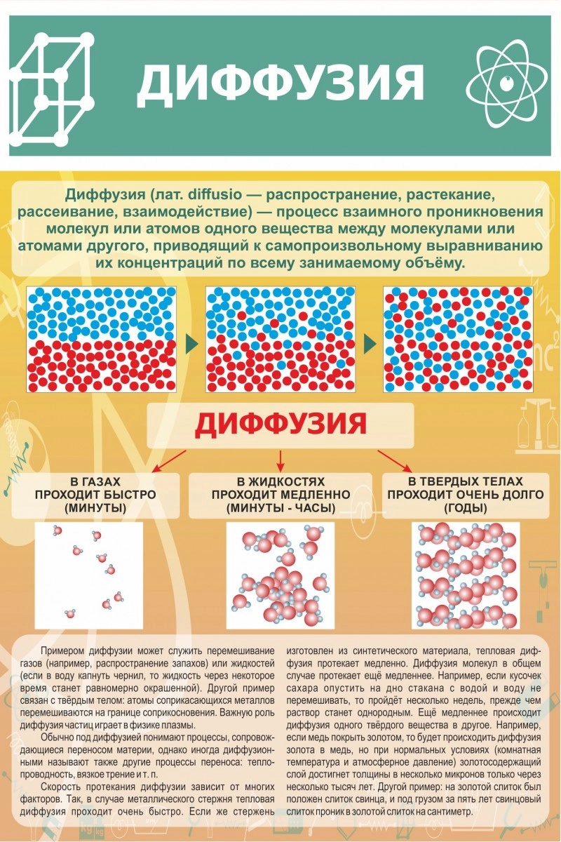 На уроках физики ученики образовательных учреждений изучают гипотезу о диффузии. Информационный стенд «Диффузия» предназначен для учащихся как наглядное пособие, на котором показано определение диффузии и все, что с ней связано. Благодаря ярким иллюстрациям можно лучше усвоить данный материал, а фоновый дизайн задуман так, чтобы привлекать внимание учащихся. Стенд сделан из легкого ПВХ, что дает возможность самостоятельного монтажа с помощью двухстороннего скотча, либо другими крепежными элементами. Наносимая ламинация поверх изображения продлевает срок службы и добавляет функцию антивандальности.