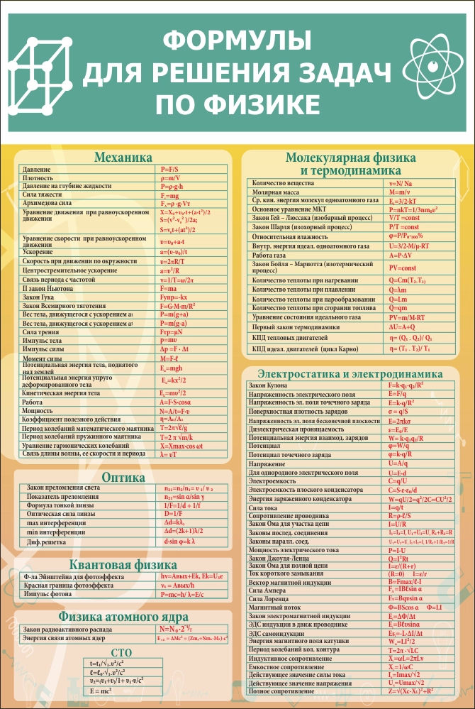 Физика — это современная наука, изучающая различные сложные формулы. Для того, чтобы учащиеся образовательных учреждений знали и быстрее запоминали все формулы, в кабинетах физики должен располагаться стенд «Формулы для решения задач по физике», который ученики смогут использовать как наглядное пособие и подсказку во время уроков. Стенд оформлен грамотно и понятно, а фоновый дизайн сделан так, чтобы стенд выделялся и позволял запомнить место его расположения в кабинете. Стенд выполнен из качественного и легкого материала ПВХ, который без каких-то проблем крепится на двухсторонний скотч или небольшие саморезы на любую стену.