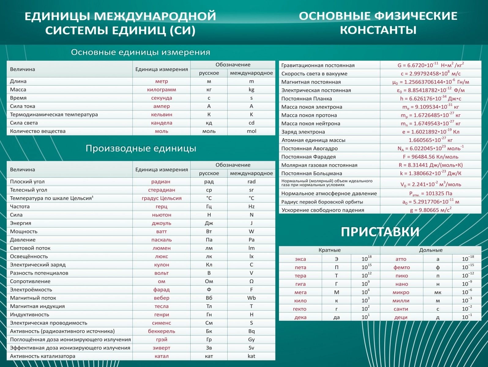 Замечательный стенд, объединяющий все известные константы и единицы измерения в одной таблице. Стенд «Основные единицы величин» послужит отличным помощником учителю и замечательной подсказкой для учеников, которые самостоятельно могут обратится к понятной таблице на стенде и не отвлекать руководителя от других дел, развиваясь самостоятельно. Практика показывает, что табличное восприятие принимается и запоминается учеником намного лучше, чем просто текстовым видом в книге из-за отсутствия лишней информации, ненужной для изучения темы, благодаря чему ученик не тратит ресурсы памяти на лишний материал.